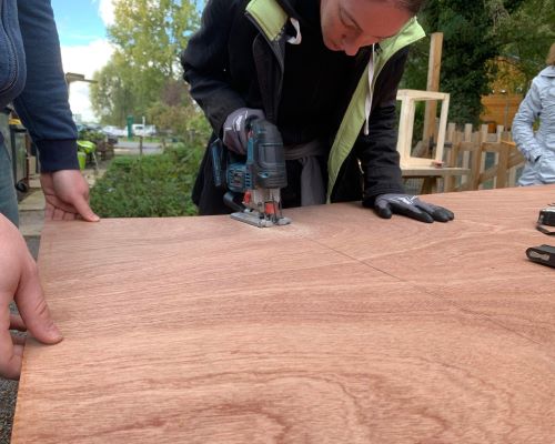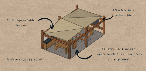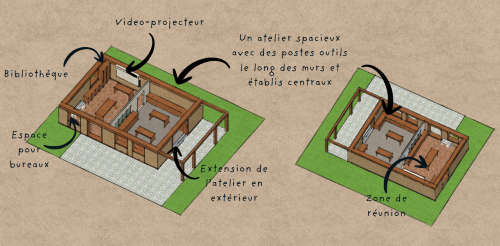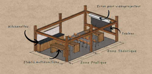 - Un espace pédagogique dans l’esprit d’une salle de cours extérieure , équipée d’établis et d’une cuisine extérieure