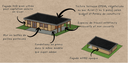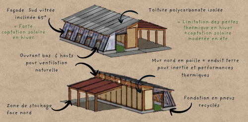 Ce bâtiment est le premier ERP de France construit en sac de sable empilés. espace rassembleur de l’éco-lieu, il propose de quoi se détendre, de quoi se restaurer et de quoi s’instruire (bibliothèque partagée). Sa salle principale, calme et confortable, accueille une partie de nos évènements.